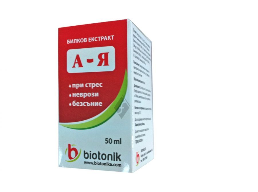 Уникална композиция от билки, които взаимно усилват действието си чрез така наречения синергичен ефект. А-Я притежава не само успокояващо, но и общо укрепващо действие върху организма. Течната форма на екстракта гарантира бързото проникване и всмукване на биологично активните вещества в кръвоносната система. За една доза 2,5 мл. (1/2 чаена лъжичка) водно етанолов екстракт 60-65% от Fl. Ulmariae (блатен тъжник) 50мг., Fl. Hiperici (жълт кантарион) 50мг., Fol. Melissae (маточина) 30мг., Rad. Valerianae (валериана) 30мг., Strubuli Lupuli (хмел) 20мг., Fl. Lavandulae (лавандула) 10мг..