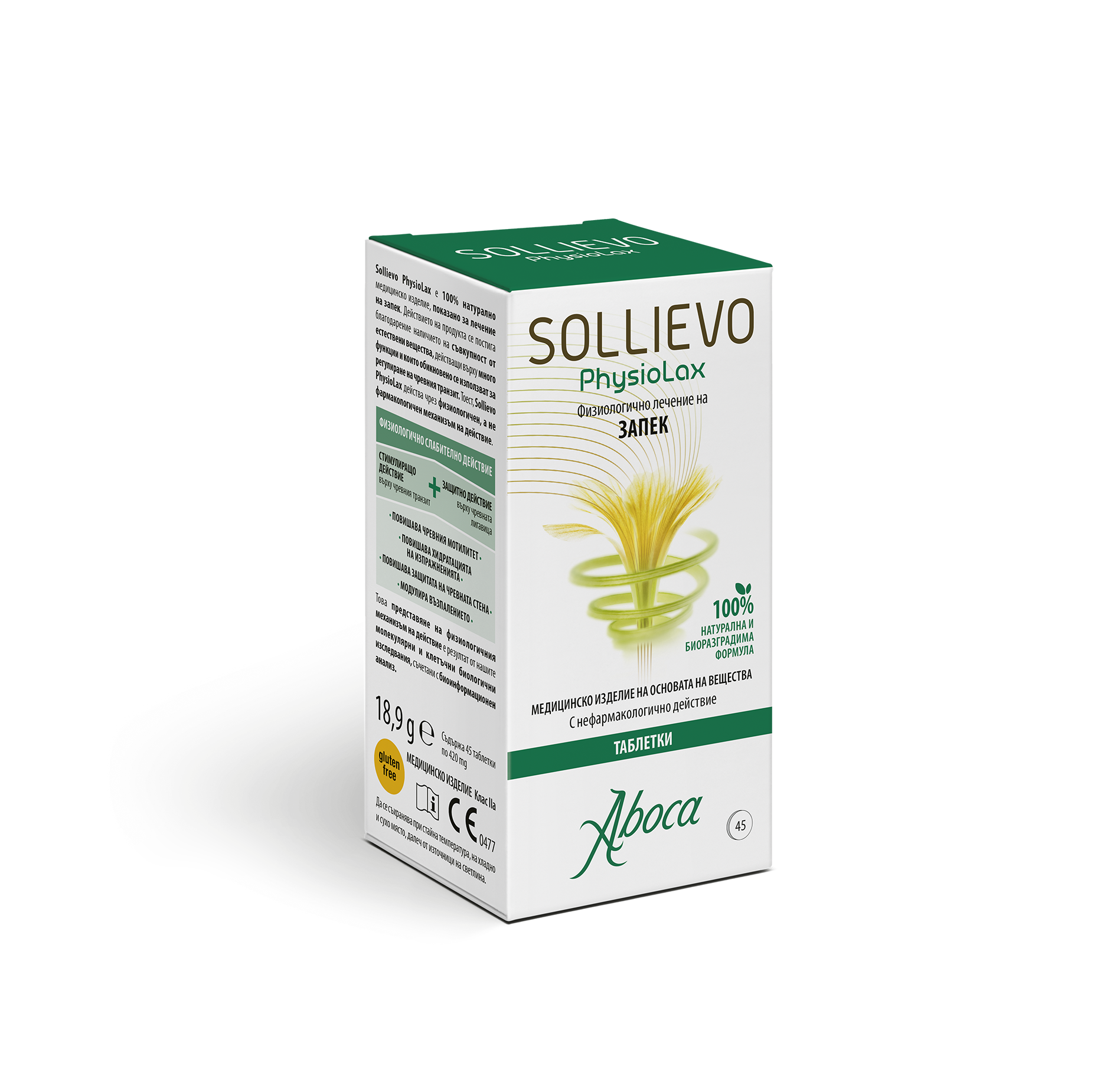 Sollievo Bio таблетки е продукт произведен от растителни съставки, получени по метода на биологично производство (Стандарт ЕО No 834/2007). Старателният подбор на суровините, гарантира продукт с високо качество, полезен за подобряване на физиологичния чревен транзит.