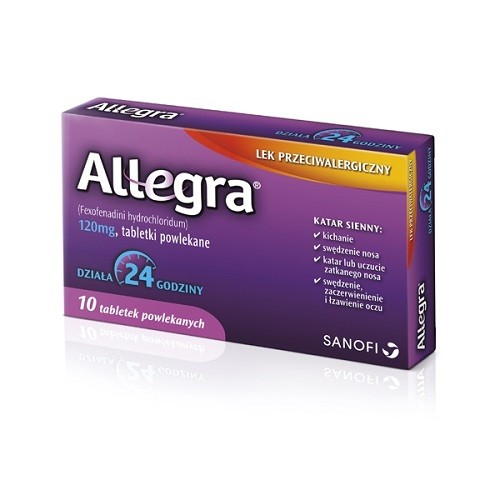 1. Какво представлява Алегра 120 mg и за какво се използва?Фексофенадинов хидрохлорид, активното вещество на Алегра 120 mg, е продукт от групата лекарства, наречени антихистамини.За какво се използва Алегра 120 mg?Алегра 120 mg се използва при възрастни и подрастващи на възраст 12 и повече години за облекчаване на симптомите на сенната хрема (сезонен алергичен ринит) като кихане, сърбящ, течащ и запушен нос и сърбящи, зачервени и сълзящи очи. 2. Какво трябва да знаете, прели да приемете Алегра 120 mg?Не приемайте Алегра 120 mg и информирайте Вашия лекар ако:сте алергични (свръхчувствителни) към фексофенадин, други антихистаминови лекарства някоя от останалите съставки на това лекарство(изброени в т.6)Предупреждения и предпазни меркиТрябва да се консултирате с Вашия лекар или фармацевт, преди да започнете употребата на Вашето лекарство ако:имате проблеми с черния дроб или бъбреците;имате или сте имали сърдечни заболявания, тъй като този лекарствен продукт може да доведе до по-бърз или неправилен сърдечен ритъм;сте в старческа възраст.Ако смятате, че някои от тези условия се отнася за Вас, или имате някакви съмнения, консултирайте се с Вашия лекар или фармацевт преди лечението с Алегра 120 mg.