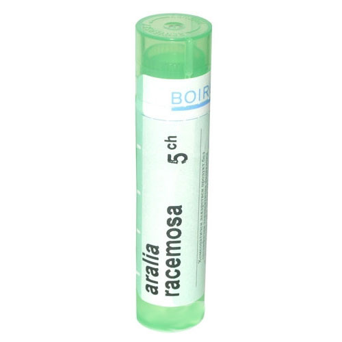ПРИЛОЖЕНИЕ;Използва се за лечение на алергичен ринит и лека хрема, причинена от простуда.Може да подобри състоянието на хора, страдащи от сенна хрема.Използва се за лечение на суха кашлица,появяваща се преди лягане.ДОЗИРАНЕ;Като част от лечението на астма Аралия Рацемоза се прилага в доза 3 гранули на всеки 2 минути.При вирусен ринит се използва Аралия Рацемоза 3- 15 CH.За лечение на суха кашлица при деца- Аралиа Рацемоза 7 CH 3 гранули 2 - 4 пъти дневно.