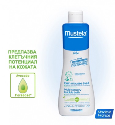 Копринената пяна, синия цвят и свежия Mustela аромат събуждат сетивата на бебето и се грижат за неговото благосъстояние.