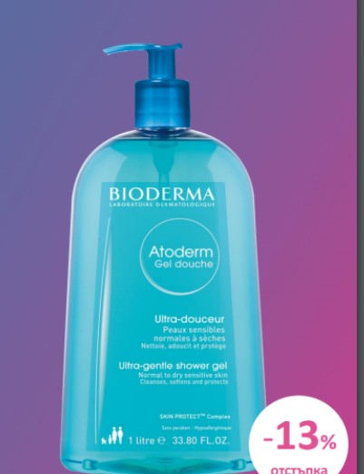 Почистващ продукт, който се пени, без сапун, Atoderm Gel Douche е идеален за ежедневна хигиена за чувствителна суха кожа. Патентованият естествен комплекс D.A.F.* повишава прага на поносимост на кожата. Благодарение на своите хидратиращи активни съставки Atoderm Gel Douche почиства, омекотява и предпазва кожата. Успокояващите му свойства намаляват чувството за опънатост. Изключително нежната му формула запазва баланса на кожата. Кремообразна текстура, ароматизирана пяна. Отлична толерантност.