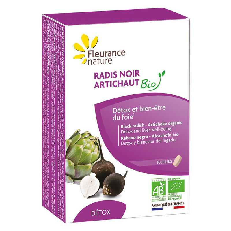 Radis Noir Artichaut BIO / Черна ряпа + Артишок, 30 таблетки е продукт на френската компания Fleurance Nature. Формулата допринася за нормалното състояние на черния дроб и жлъчката.