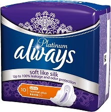 Превръзките "Platinum" на "Always" не само осигуряват най-добрата защита, но имат луксозно меко като коприна и не задържащо влагата покритие. Сърцевината, характерна само за превръзките "Always Platinum", разполага със супер абсорбиращ гел, който незабавно се превръща в течност, оставяйки горния слой сух и луксозно мек като коприна.