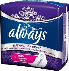Превръзките "Platinum" на "Always" не само осигуряват най-добрата защита, но имат луксозно меко като коприна и не задържащо влагата покритие. Сърцевината, характерна само за превръзките "Always Platinum", разполага със супер абсорбиращ гел, който незабавно се превръща в течност, оставяйки горния слой сух и луксозно мек като коприна.