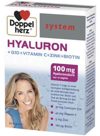 Всяка капсула Допелхерц® систем Хиалурон 100 съдържа 100 mg хиалуронова киселина в комбинация с хранителни вещества, които допринасят за запазване на естествената красота на кожата, поддържането на нейния тургор и свеж вид.