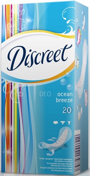 Ежедневни дамски превръзки на "Discreet", даващи усещане за комфорт и свежест през целия ден. Имат отлично абсорбиращо действие и са подходящи за употреба при всеки тип бельо. Материята на горния им слой наподобява дантела и има невероятна мекота, като същевременно с това превръзките са изключително тънки - 0.9 mm. Позволяват на кожата да диша и са напълно невидими. Неприятното усещане за разместване от бельото Ви е премахнато, тъй като прилепват плътно за него. Благодарение на приятния им аромат на морски бриз, чувството за свежест и защита е с Вас до 12 часа.