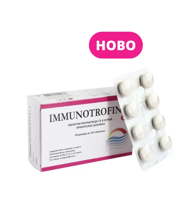 Immunotrofina D диспергиращи таблетки е хранителна добавка, която съдържа Бета-глюкани от маята (Saccharomyces cerevisiae) и е богата на витамини A, B5, C, D, E и на цинк. Тези вещества изпълняват важни физиологични действия в организма, като: Витамини A, C, D, и цинк допринасят за поддържане на нормалното функциониране на имунната система. Витамин B5 (калциев D-пантотенат) и витамин C допринасят за поддържане на нормалния енергиен метаболизъм и за намаляване на умората и чувството на отпадналост. Витамин E, витамин C и цинк допринасят за защита на клетките от оксидативен стрес. Бета-глюканите от маята са микроелементи, извлечени от Сахаромицес церевизия.