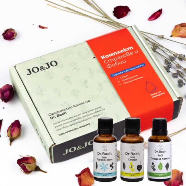 Комплект *Страхове и Фобии* съдържа 3 вида комбинации капки на д-р Бах – Страх, Тревожност, Спешна помощ.