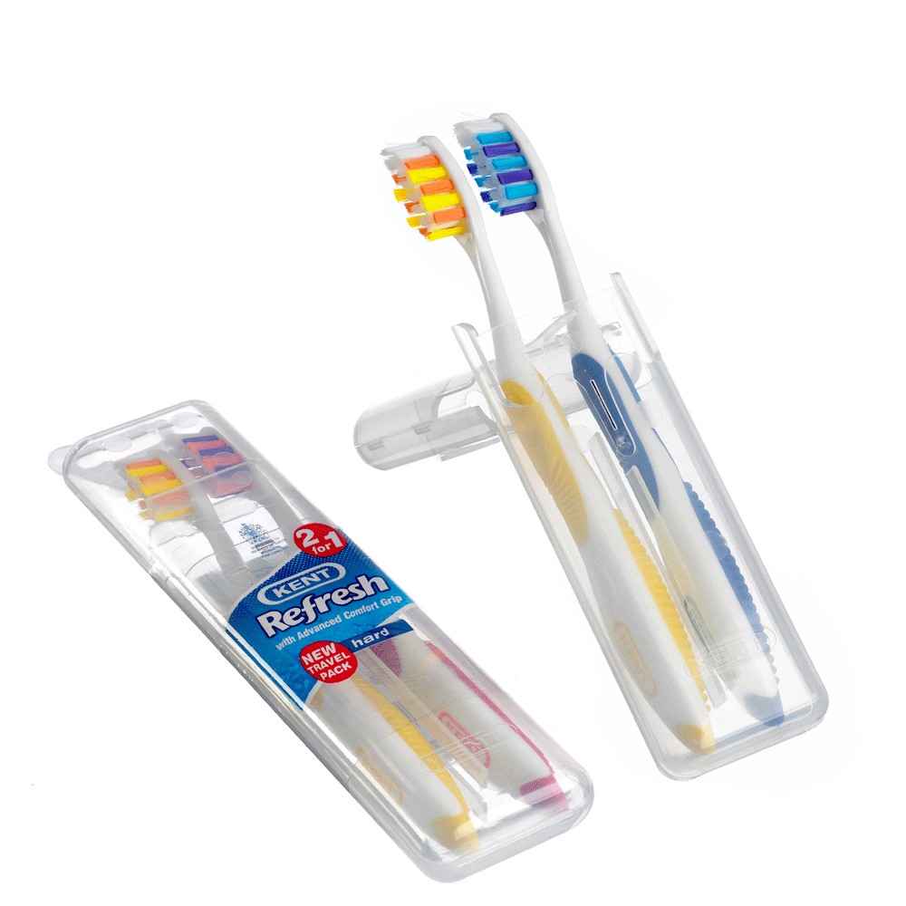 Комплект четки Duo в уникален удобен за път пластмасов калъф. Трипластовата четка ефективно достига всички части на зъбите, благодарение на скосените си краища.