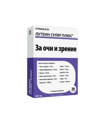 СЪСТАВ: цинков глюконат, колаген - хидролизат, желатин (капсула), аскорбинова к-на (витамин С), DL-алфа-токоферил ацетат (витамин Е), лутеин 20%, екстракт от черна боровинка (20% полифеноли, 18 % антоциани), рутин, зеаксантин (10%), бета каротен (20%), пълнител (декстрин), калциева сол на ортофосфорната к-на (дикалциев фосфат), L - селенометионин, меден сулфат, рибофлавин (витамин В2), антислепващи агенти (магнезиев стеарат, силициев диоксид).