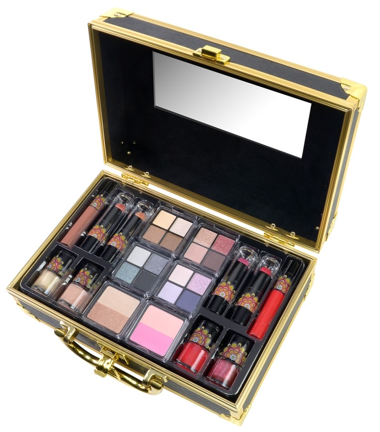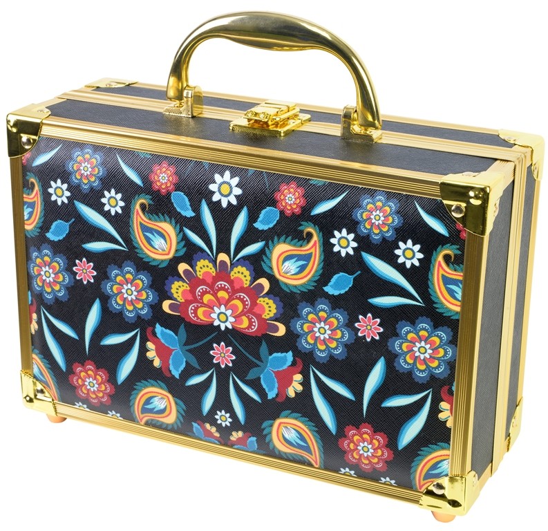 Комплектът е представен в ефектен пъстър кожен куфар, златно окантен, в моден дизайн стил #BohoChic, с дръжка, секретно закопчаване и с огледало. Идеален както за носене комплекта при пътуване, така и за съхраняване на гримове, бижута, аксесоари.
