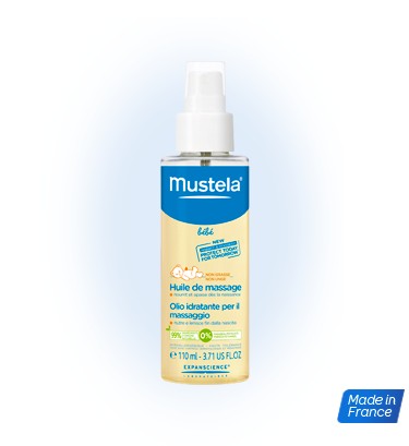 Масажното олио на Mustela е специално формулирано за използване от деня на раждането*