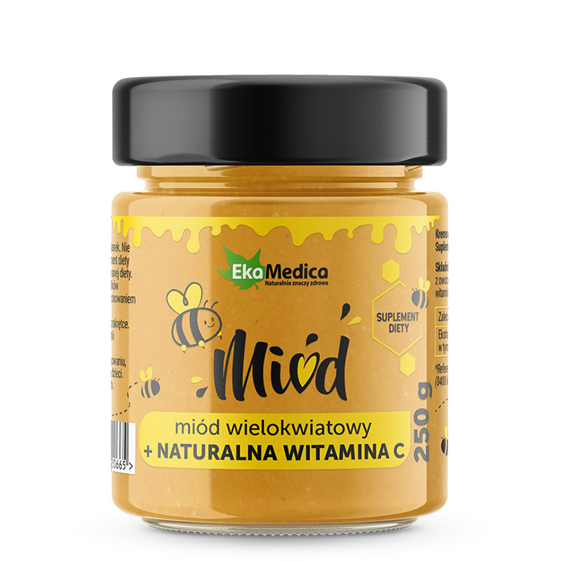 Многоцветният мед с витамин С на Ekamedica е натурален продукт с мощни антиоксидантни свойства. Той съчетава в себе си предимствата на полифлорния мед с полезните свойства на екстракта от шипка и аскорбиновата киселина. Подпомага правилното функциониране на имунната система, повишава енергията подобрява работата на нервната система.