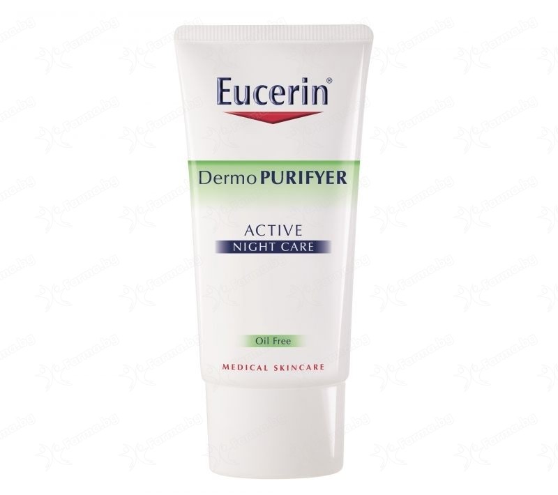Eucerin DermoPURIFYER Активен Нощен крем е с високоефективна формула с Млечна киселина и без мазнини. Той осигурява на кожата продължителна доставка на Млечна Киселинапрез нощта. Активният комплекс е със специална насочваща система, която излющва мъртвите клетки, намалява производството на себум и оптимално подготвя кожата за подходящата дневна грижа. Подходящ за употреба с повечето медикаменти против акне.