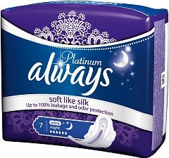 Превръзките "Platinum" на "Always" не само осигуряват най-добрата защита, но имат луксозно меко като коприна и не задържащо влагата покритие. Сърцевината, характерна само за превръзките "Always Platinum", разполага със супер абсорбиращ гел, който незабавно се превръща в течност, оставяйки горния слой сух и луксозно мек като коприна.