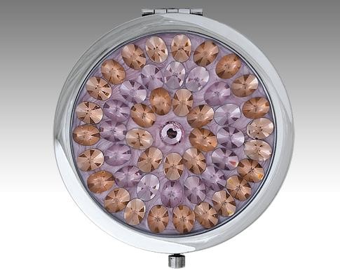 Огледало с кръгла форма, украсено с кристали. Един аксесоар, които всяка дама трябва да притежава. Малко, красиво и удобно, побиращо се във всяка козметична чантичка. Опаковано е в красива подаръчна кутийка.