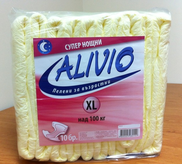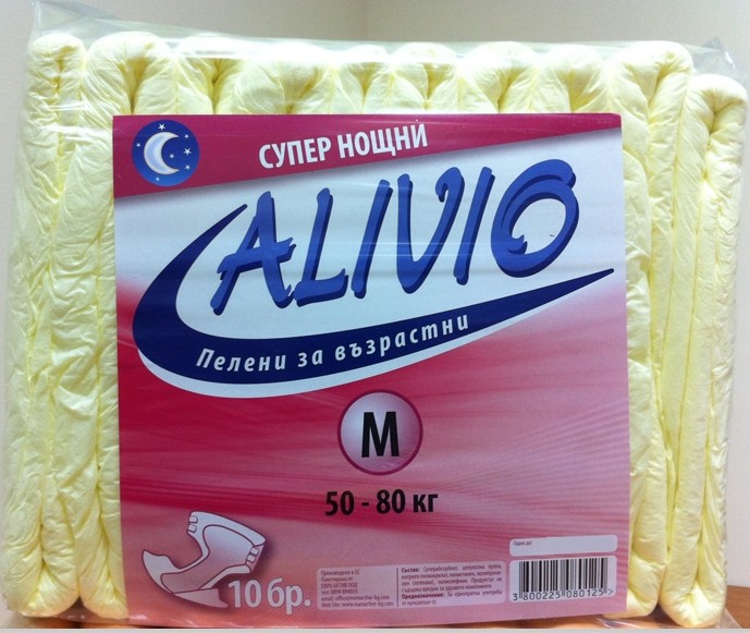 Aliviо супер абсорбиращи пелени, уместни за употреба от нуждаещи се при тежка инконтиненция, както и за пациенти в болнични условия. Aliviо пелена (памперс за възрастни) индивидуално хигиенно средство с умерена до тежка инконтиненция за еднократна употреба. Осигурява значителна защита от протичания. Подходящи за подвижни и лежащо болни хора. Възможност за многократно затваряне и отваряне на пелената, без риск от повреда на външния слой. Дишаща материя комфорт и оптимална защита. Предлага се в няколко рамера и абсорбираща способност. Подходящи за ЛЕЖАЩО БОЛНИ хора.