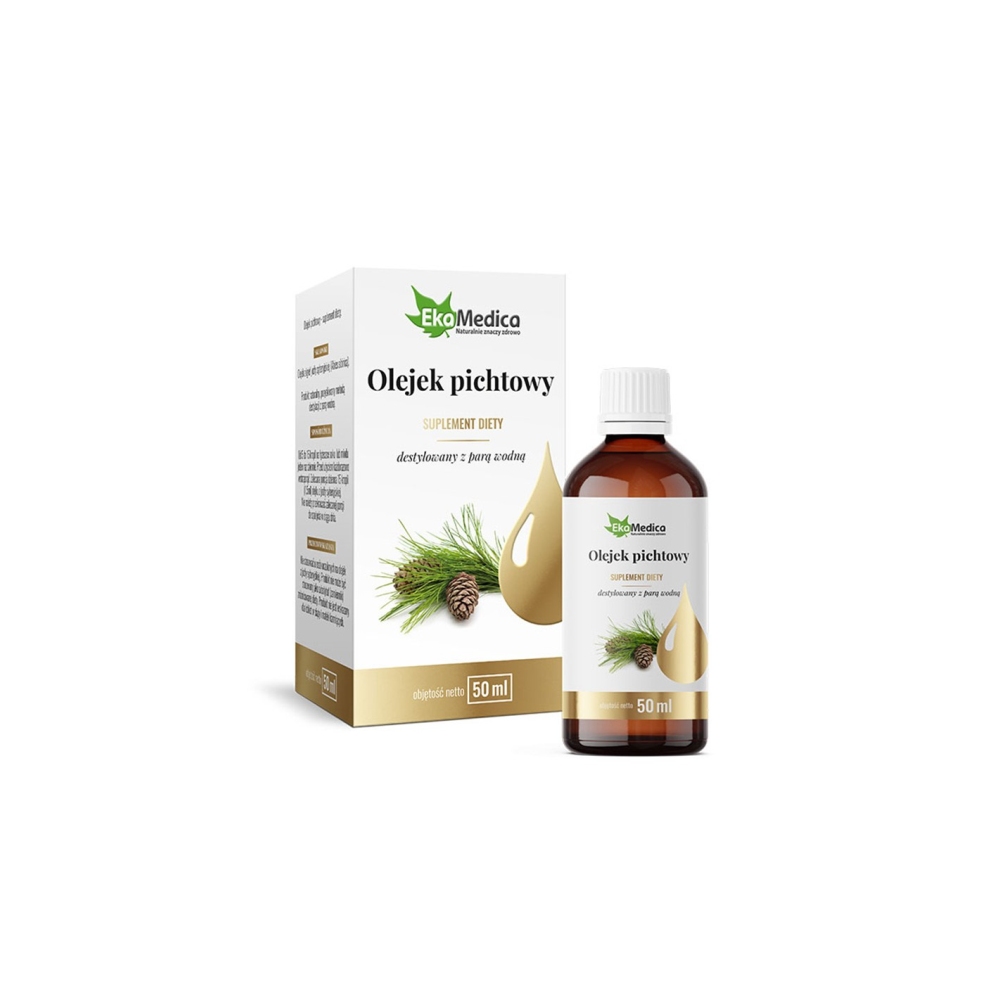 Olejek Pichtowy 50 ml – 100 представлява 100% натурално пихтово масло от иглички от сибирска ела, получено чрез парна дестилация. Сибирската бяла ела расте само в Далечния изток - в Сибир, Китай, Киргизстан и Монголия. От младите му филизи и иглички се пресова пихтово масло. Пихтовото масло съдържа летливи фитоциди и терпени, например камфор, който затопля, подобрява кръвообращението в кожата и успокоява болката. Кадиненът, открит в това масло, има противовъзпалителни свойства, кумуленът и борнеолът имат успокояващи свойства, докато алфа-пиненът улеснява отхрачването. Пихтовото масло, приемано през устата, е много ефективно средство срещу инфекции на горните дихателни пътища. Предотвратява развитието на настинка, грип, ангина, хрема и кашлица, като същевременно подпомага състоянието и след боледуване от тези заболявания. Пихтовото масло се използва и външно, например под формата на компреси при изгаряния и трудно зарастващи рани. Този продукт се препоръчва и за хора, които се борят с акне или черни точки.
