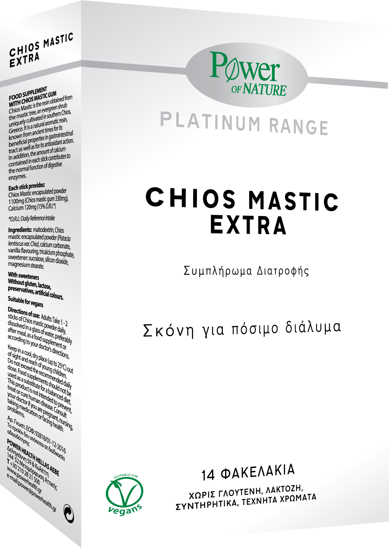 Състав: Mалтодекстрин, капсулиран прах от мастика от Хиос (Pistacia lentiscus var. Chia), калциев карбонат, аромат на ванилия, калциев фосфат.