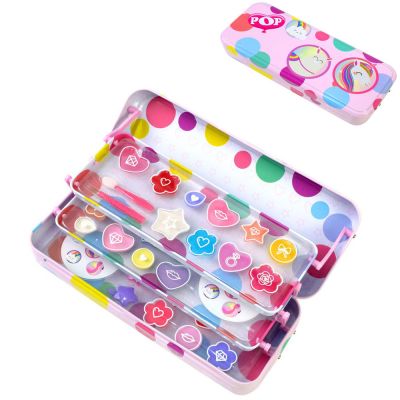 Комплект продукти за грим за малки момичета в метална кутия от колекция POP. Кутията е разгъваема на три нива, подходяща за учебно пособие.