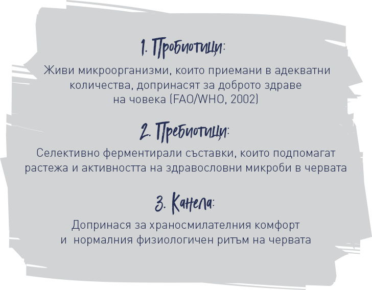 Нормалната перисталтика и нормалния физиологичен ритъм на червата са символ на здравословен начин на живот. Това може да бъде постигнато с уникална хранителна добавка с изследвани пробиотични дрожди Saccharomyces Boulardii и два мощни пробиотични щама, допълнени с пребиотици и екстракт от кора на канела. Екстрактът от кора от канела допринася за нормалната честота на изхождания и здравето на храносмилателния тракт.