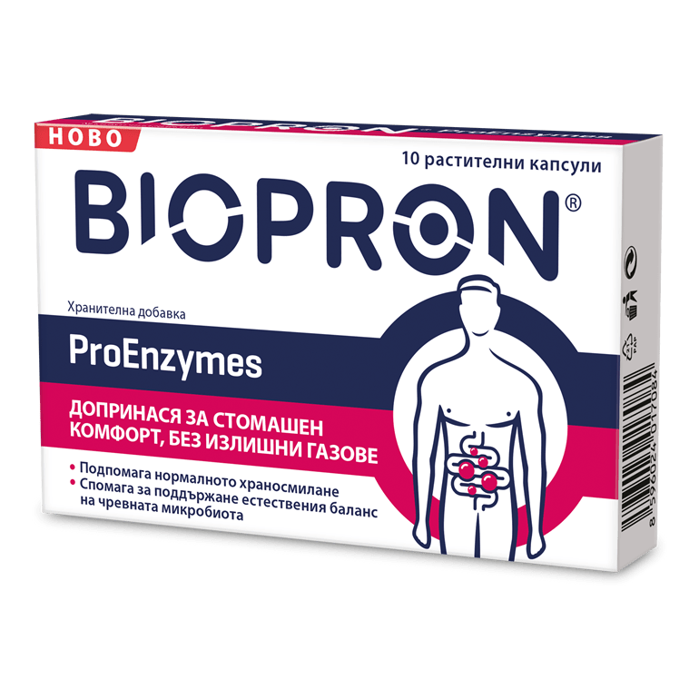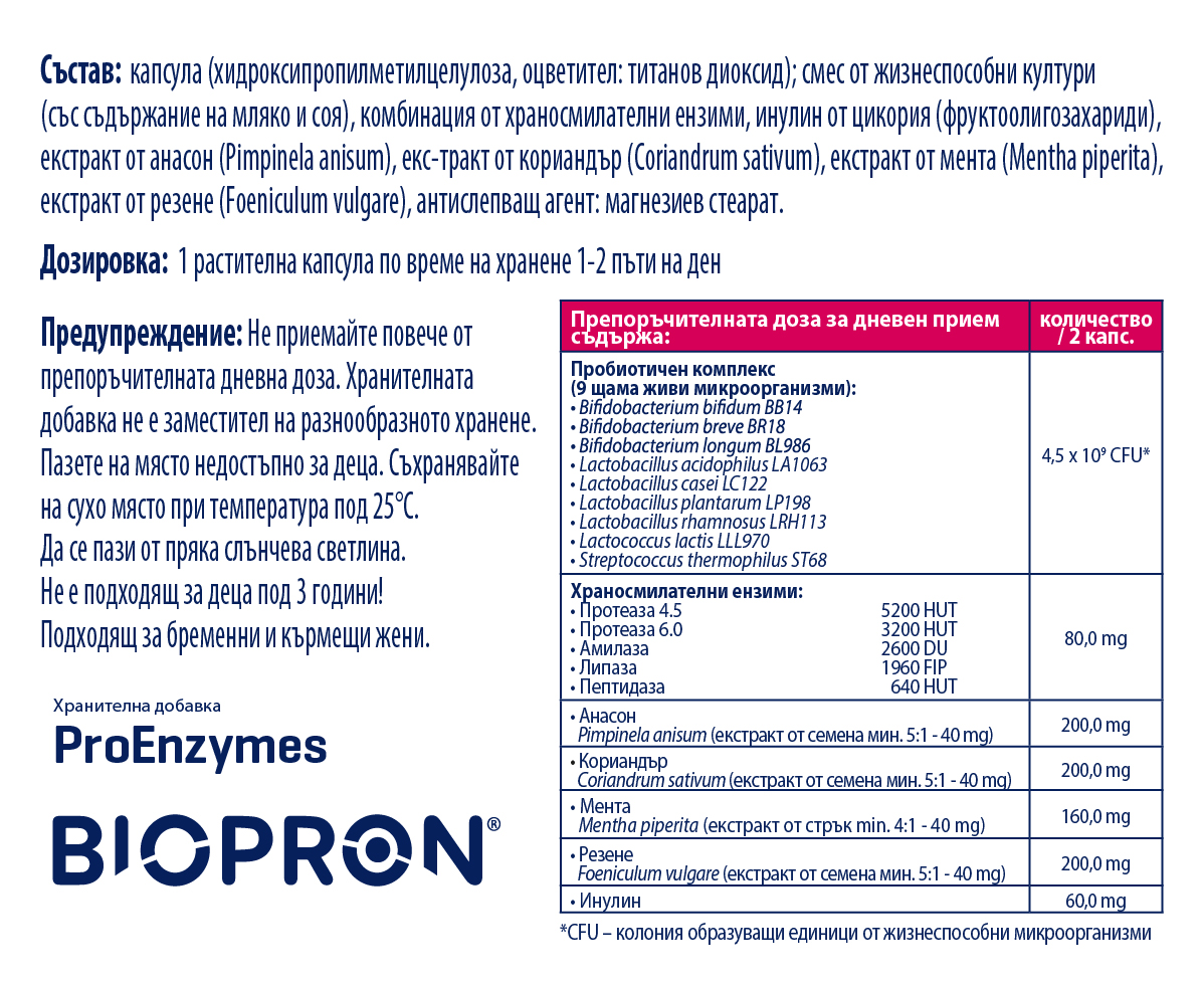 Тази хранителна добавка с уникална формула комбинира храносмилателни ензими с 9 мощни пробиотични щама и билкови екстракти, подкрепящи храносмилането. Така БИОПРОН ПроЕнзими допринася за стомашен комфорт и поддържане на нормалното храносмилане – без излишни газове. Комбинацията от пробиотици и пребиотици (синбиотик) спомага ефективно за поддържане на баланса на чревната микробиота.