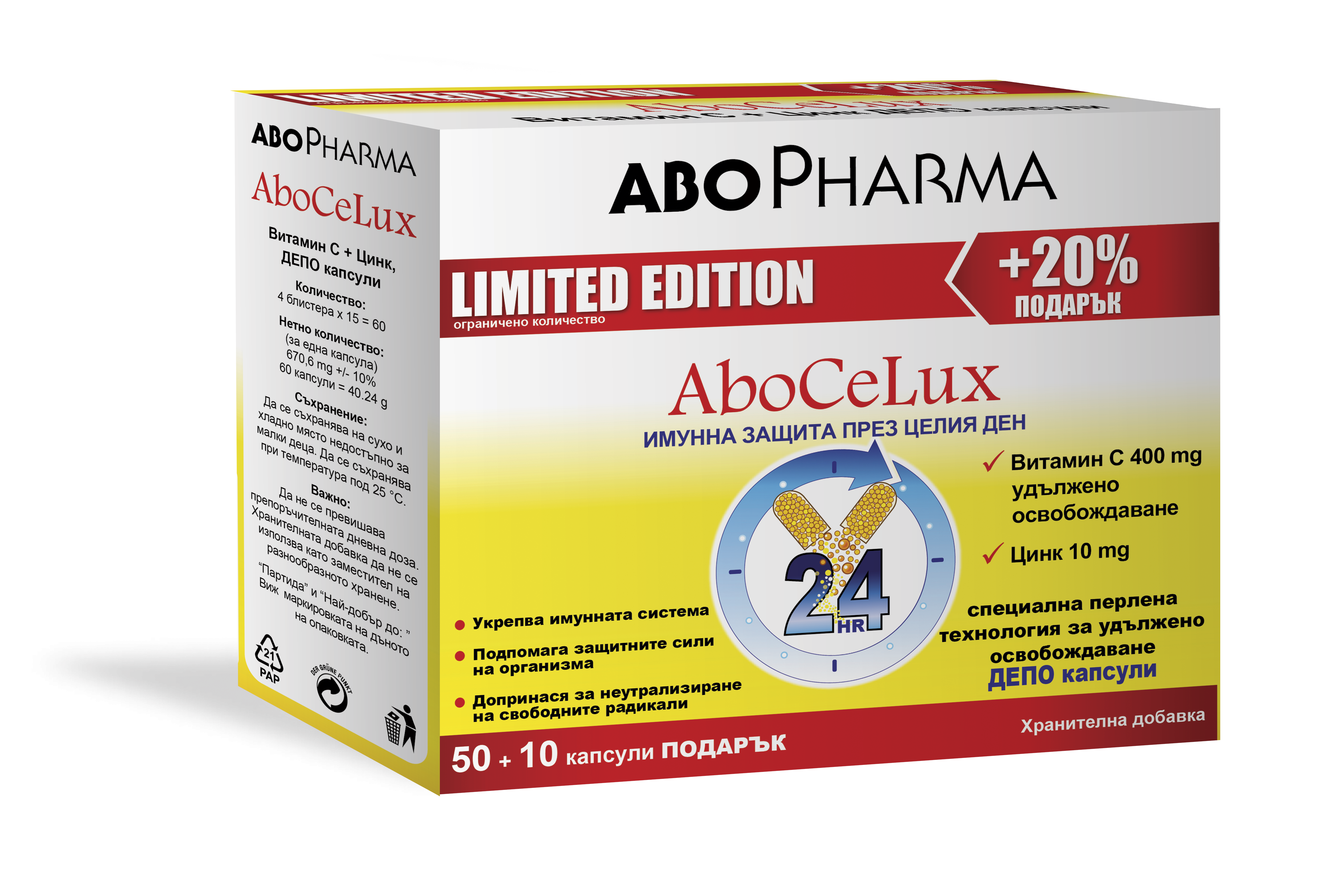 Абоцелукс представлява комбинация от Витамин С и Цинк – ключови елементи, които допринасят за нормалната функция на имунната система, за защитата на клетките от оксидативен стрес, за нормалната функция на костите, кръвоносните съдове и ставите.