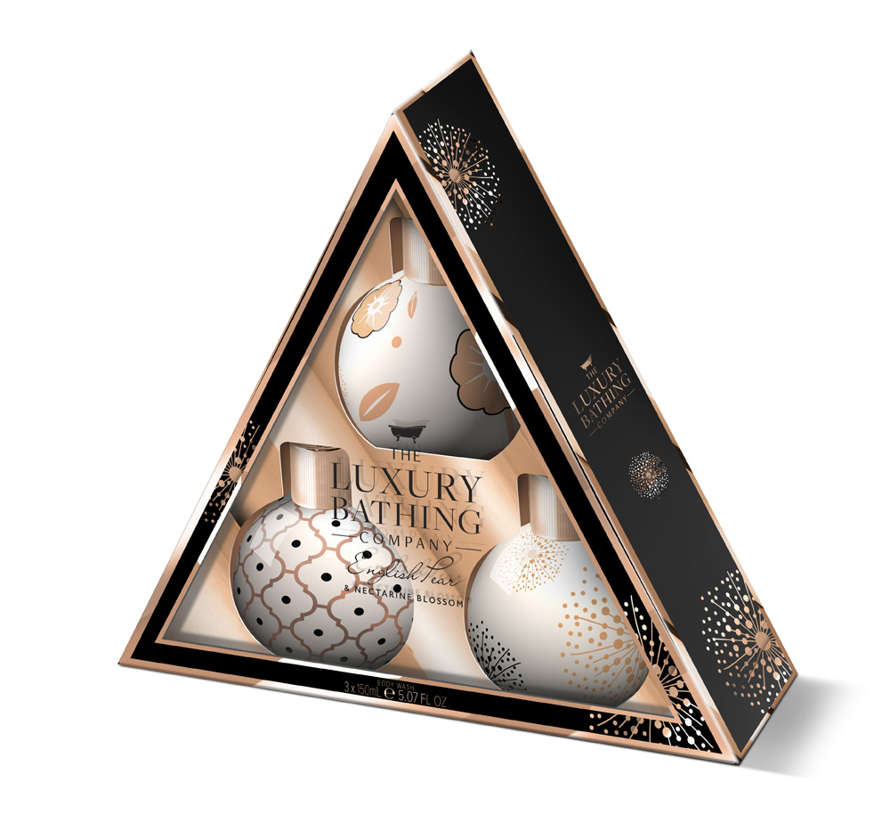 Комплектът съдържа три душ гела с форма на коледни топки с три различни дизайна.