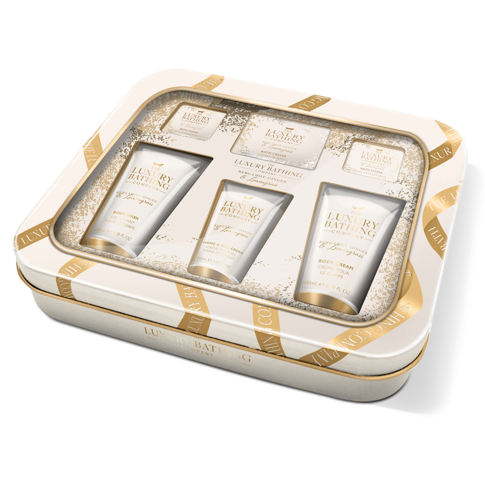 Луксозен подаръчен комплект от 6 продукта за тяло в метална кутия.