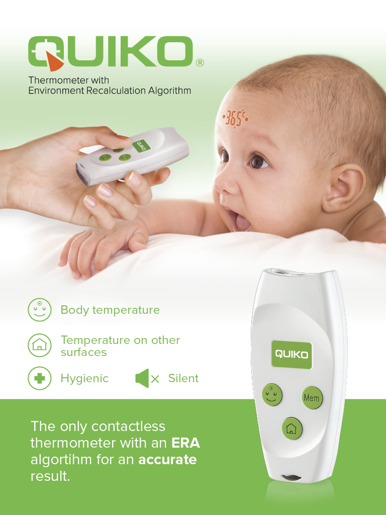 Quiko Era е безконтактен, абсолютно безшумен и точен термометър. Специалният алгоритъм ERA отчита влиянието на стайната температура, за да даде точен резултат за тялото.