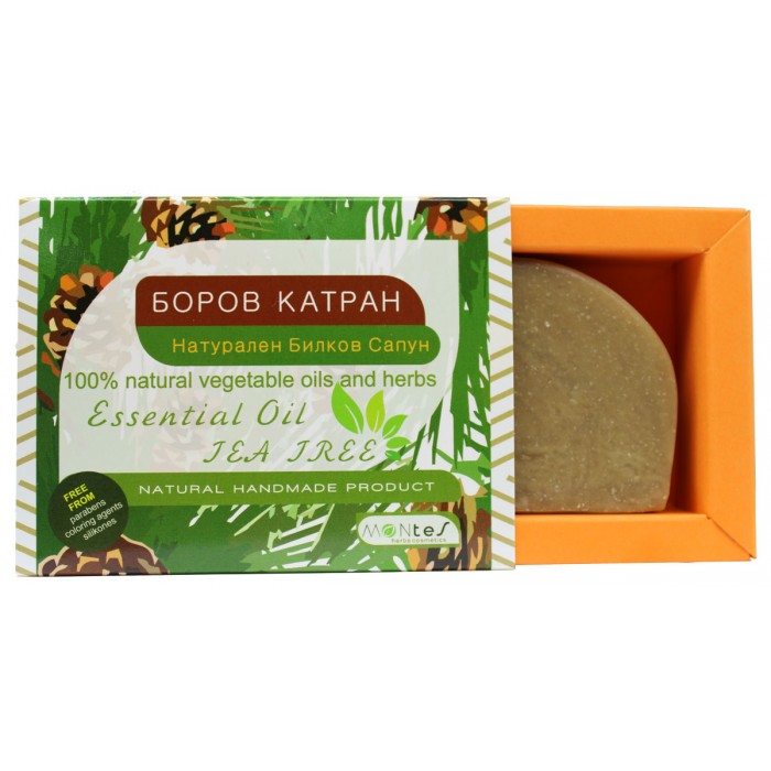 Сапуна с БОРОВ КАТРАН нежно измива без да изсушава кожата. Има противовъзпалително и антибактериално действие. Спира развитието на пърхот. С добавено етерично масло ЧАЕНО ДЪРВО. БЕЗ ПАРАБЕНИ , ОЦВЕТИТЕЛИ И СИЛИКОНИ.