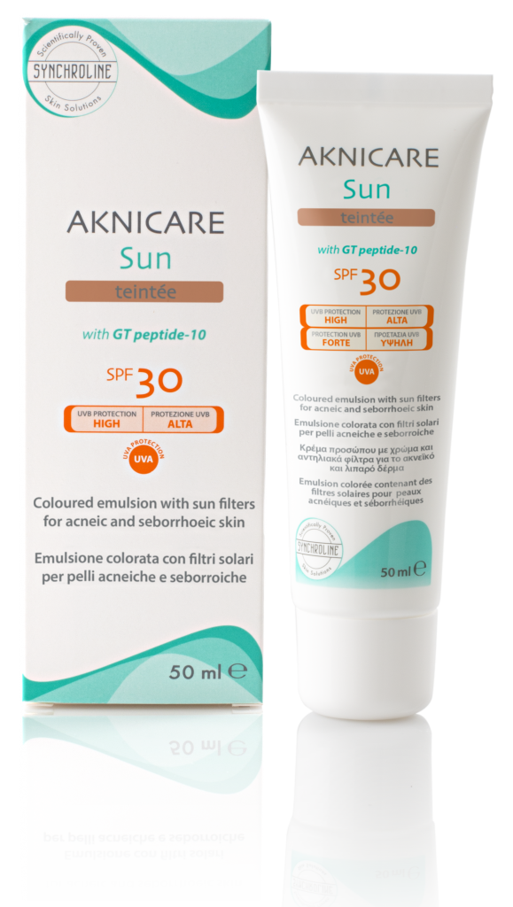Synchroline Aknicare Sun Teintée е оцветен слънцезащитен крем за кожа склонна към акне. Предпазва кожата от слънчевите лъчи.