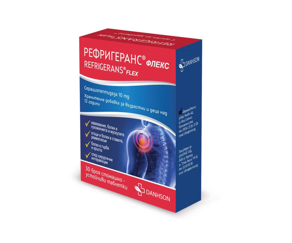 Рефригеранс Флекс е хранителна добавка, съдържаща протеолитичния ензим Серациопептидаза, който оказва благоприятен ефект при неразположения, свързани с опорно-двигателния апарат.