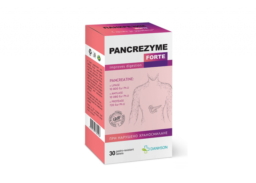 Всяка филм. табл. съдържа 240 mg Панкреатин, който съдържа естествените храносмилателни ензими: