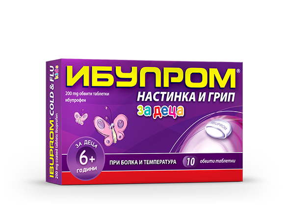 Ибупром Настинка и Грип за деца е модерно и ефикасно температуро-понижаващо, противовъзпалително и болкоуспокояващо средство, предназначено за деца над 6 години. Малки таблетки, със сладка и гладка обвивка, лесни за преглъщане от деца.
