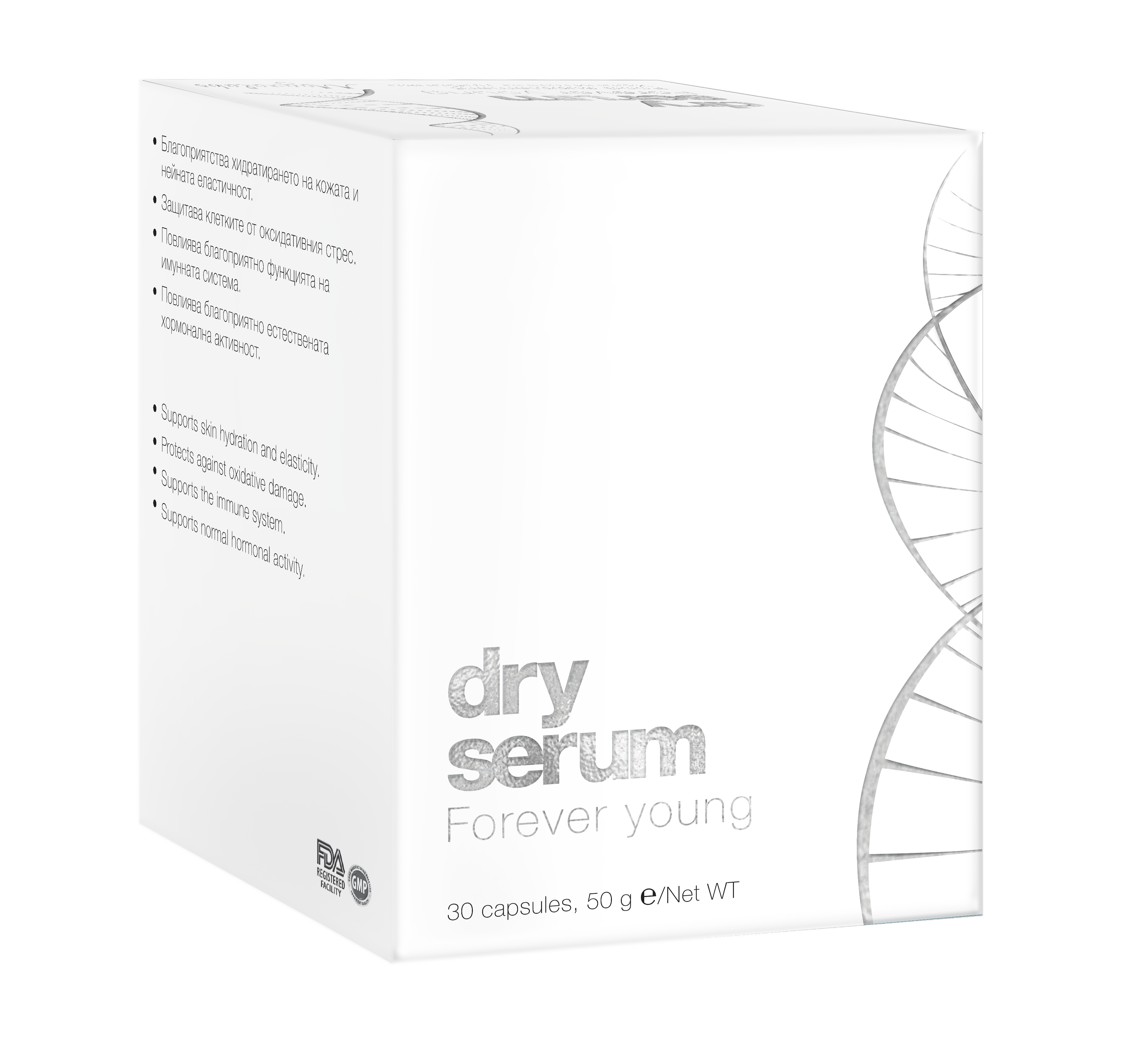 Dry serum Forever Young благоприятства хидратирането на кожата и нейната еластичност, както и защитава клетките от оксидативен стрес. Предпазва от появата на бръчки и пигментации, влияе благоприятно върху функцията на имунната система и естествената хормонална активност.