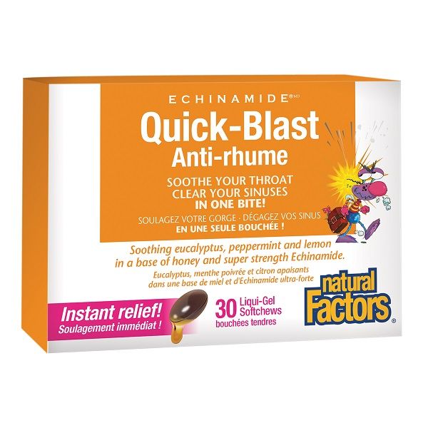 Куик-бласт е бързо действаща формула със съдържание на патентован екстракт от ехинацея пурпурея (ECHINAMIDE®) , както и патентована смес от мед, ментол, лимоново масло, масло от мента и евкалиптово масло.