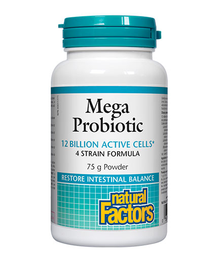 Мега пробиотик на Natural Factors осигурява 12 милиарда активни пробиотични клетки от 4 щама във всяка доза. Формулата предоставя сигурна и напълно естествена подкрепа за поддържане и възстановяване на чревната и вагинална микрофлора. Мега пробиотик подобрява усвояването на хранителните вещества от храната, редуцира чревни неразположения като диария и запек, включително и при лактозна чувствителност. Този пробиотик притежава мощен ефект за противодействие на хранителни патогени, причинители на бактериалните инфекции салмонелоза, листериоза и заболявания, причинени от ешерихия коли.