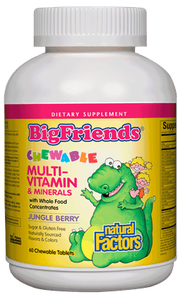 Фитонутриентите във вкусните таблетки Мултивитамини и минерали Big Friends® за деца (плодове от джунглата) 238 mg са извлечени от organic плодове и зеленчуци от плантациите на OkanaganValley, Британска Колумбия, където се отглежда голямо разнообразие от organic растения. Плодовите и зеленчуковите екстракти във формулата, са обработени чрез TheEnviroSimplex ™ – специална технология, разработена от NaturalFactors, която оптимизира концентрацията на плодовите и растителните екстракти, и напълно запазва силата на биологично активните вещества, открити в свежите, пресни храни.