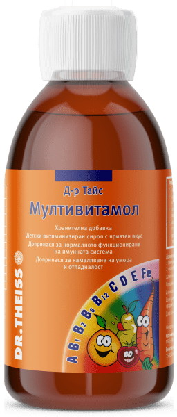 Д-р Тайс Мултивитамол, детски витаминизиран сироп с приятен вкус, допринася за нормалното функциониране на имунната система, за намаляване на умората и отпадналостта.