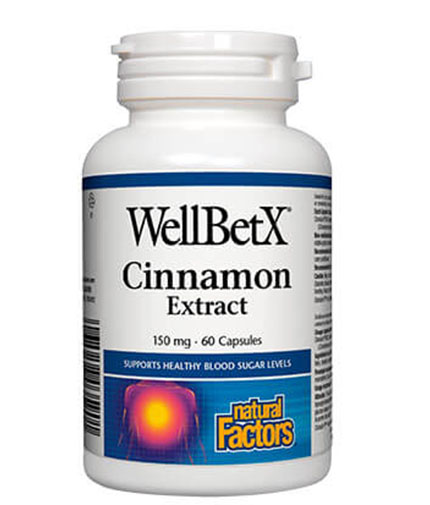 WellBetX® Канела екстракт 150 mg е природен продукт, част от специализираната серия на Natural Factors, Canada – WellBetX, създадена за хора с диабет тип 2 или предиабетно състояние.