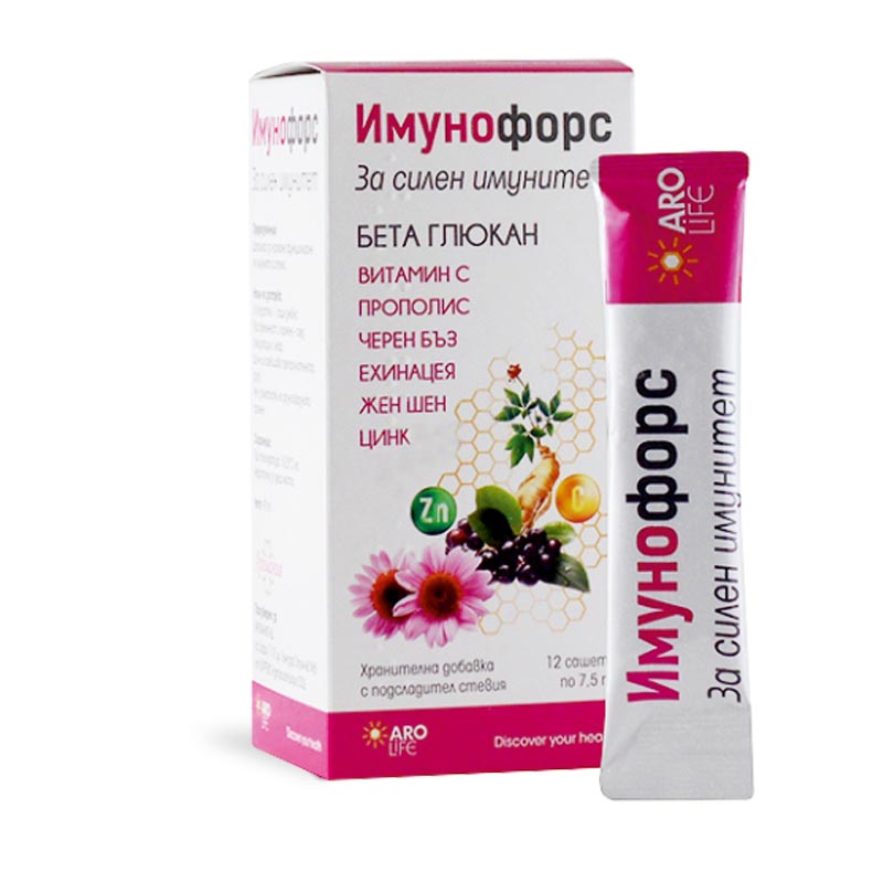 Имунофорс е иновативна комбинация от растителни съставки, с добавени витамин С и цинк. Допринася за нормална функция на имунната система.