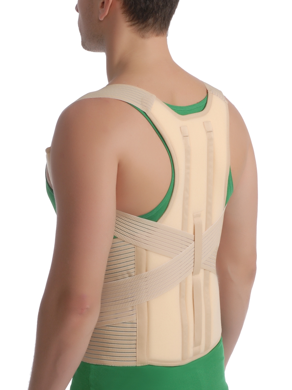 Двата подвижни метални подсилващи елемента осигуряват надеждно поддържане на гръдния и поясен отдел на гръбначния стълб, като еластичните колани плавно разпределят напрежението върху раменете.