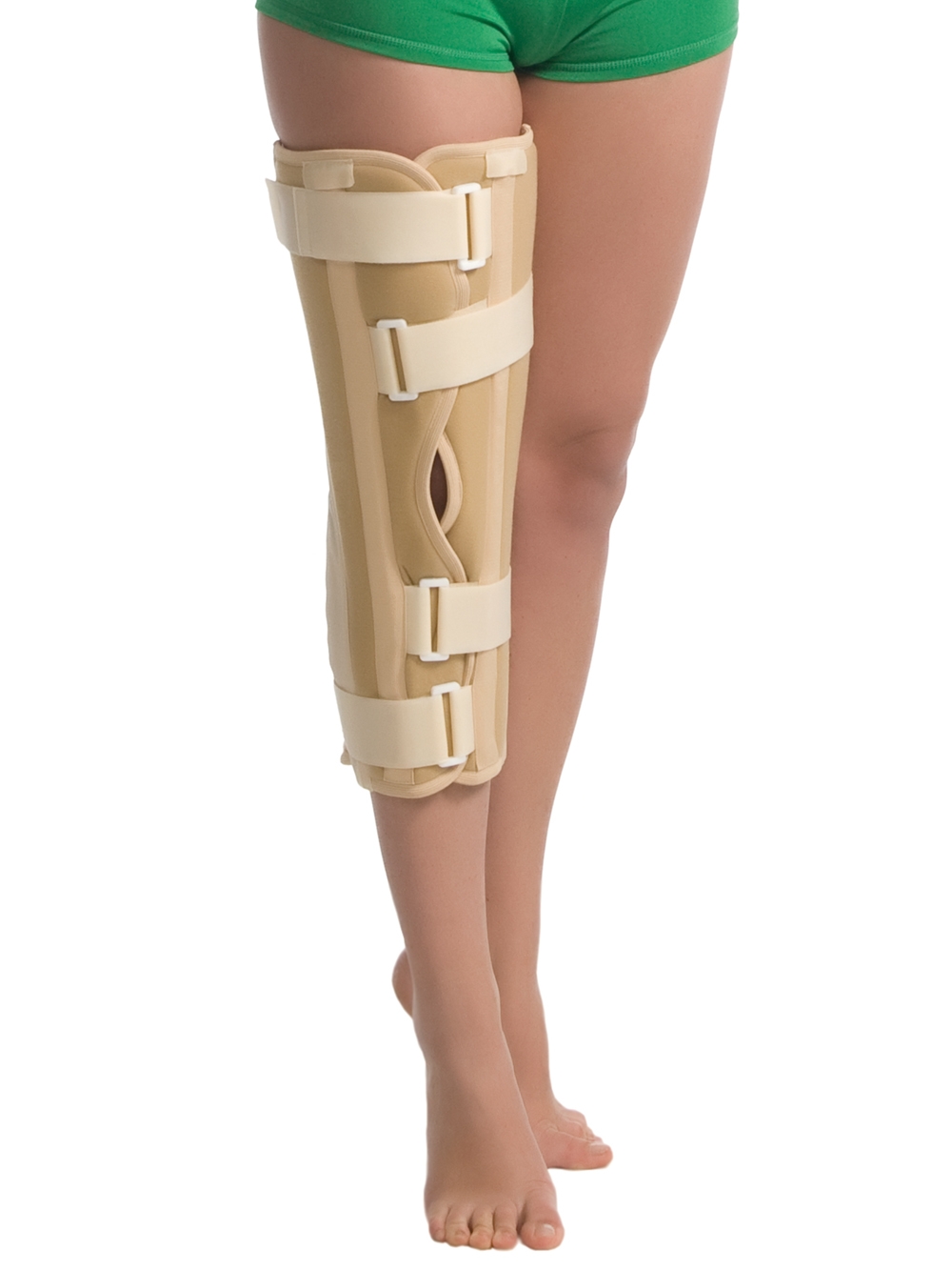 Трите метални ребра надеждно фиксират колянната става, а коланите с велкро закопчаване гарантират плътното прилягане (прилепяне) на тутура към крака на пациента.
