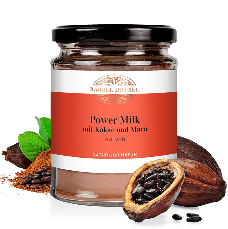 Power Milk mit Kakao und Maca Pulver е отлична здравословна алтернатива на сутрешното кафе – действа силно ободряващо, без да предизвиква свръхвъзбудимост и нервност.