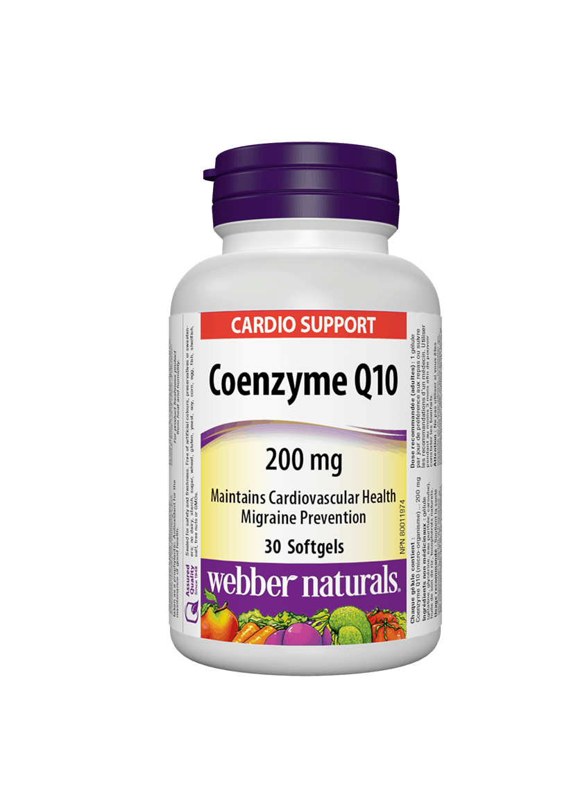 Подпомага сърдечното здраве и допринася за намаляване на мигренозното главоболие. Продуктът на Webber Naturals съдържа коензим Q10 (CoQ10) – витаминоподобно съединение, осигуряващо широк спектър ползи за здравето. Най-важна е ролята на коензим Q10 за сърцето и кръвоносните съдове, но неговите благоприятни ефекти засягат и антиоксидантната защита на организма, репродуктивните способности, неврологичното здраве и баланса на мозъчните невротрансмитери, кожата, лигавиците и съединителната тъкан.