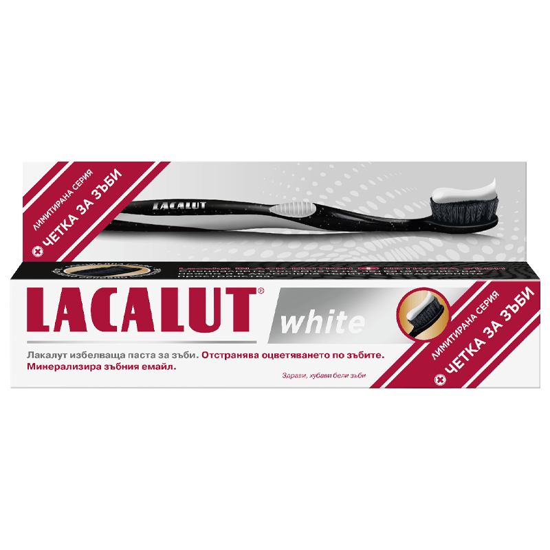 Lacalut White е медицинска избелваща паста за зъби, която отстранява оцветяването по зъбите причинено от никотин, чай, кафе или от някои други храни и напитки и минерализира зъбния емайл. Продуктът на лакалут има избелващ ефект и след редовна и честа употреба зъбите са видимо по-бели, зъбният емайл е заздравен, а кървенето на венците намалено. Пастата на Лакалут освежава дъха и е ефективна защита срещу кариес.