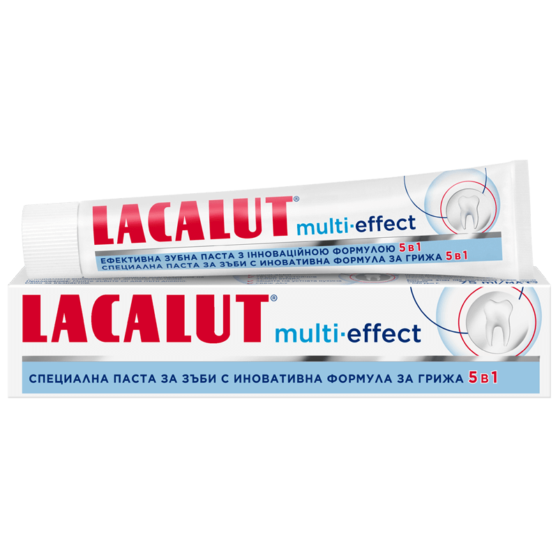 Lacalut Multi Effect е паста за зъби 5в1 за цялостна грижа на устната кухина, притежаваща иновативна формула, която възстановява успешно зъбния емайл и защитава зъбите от появата на кариеси. Пастата за зъби на Lacalut съдържа специална комбинация от активни съставки, които се грижат за укрепването на венците, като същевременно намаляват оцветяването на зъбите и предотвратява повторната му поява. Пастата освежава дъха, а при редовната ѝ употреба зъбите са цялостно защитени и блестящи.