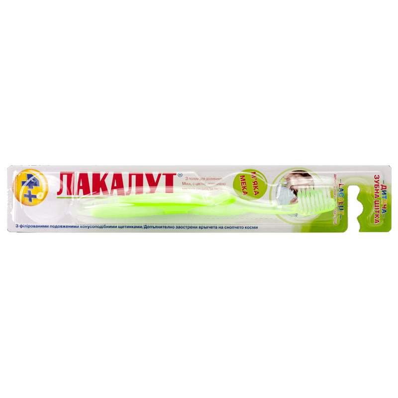 Тя почиства цялата устна кухина без затруднения, както и вътрешните и външните части на зъбите. Снабдена е с допълнително заострени връхчета на снопчето косми, които спомагат за основното почистване на млечни зъби и в същото време не нараняват чувствителните детски венци. Четката за зъби за деца над 4 години от Лакалут е мека и има цветно обозначено място в средата за пастата.